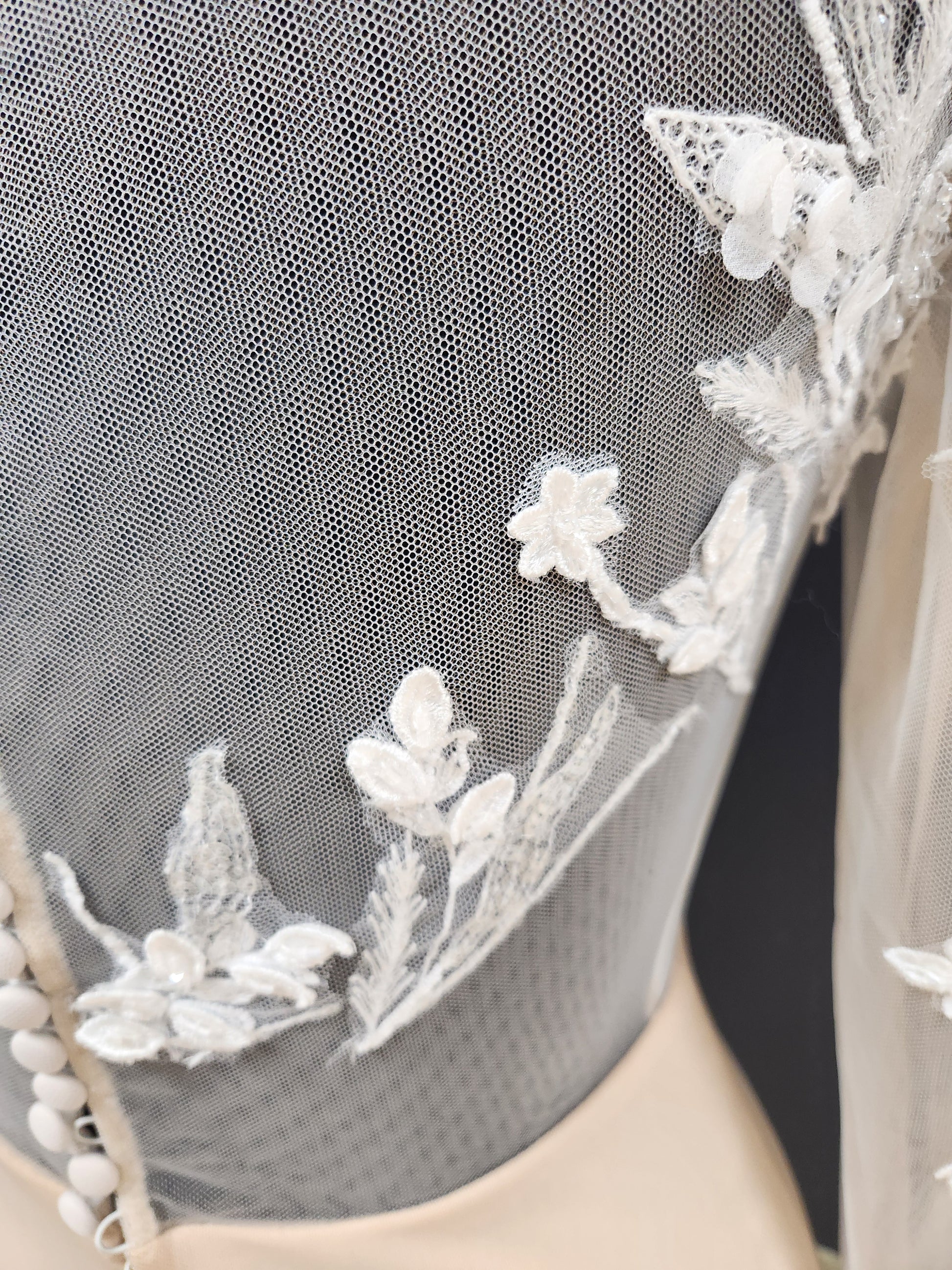 - Loose/clear threads throughout the gown