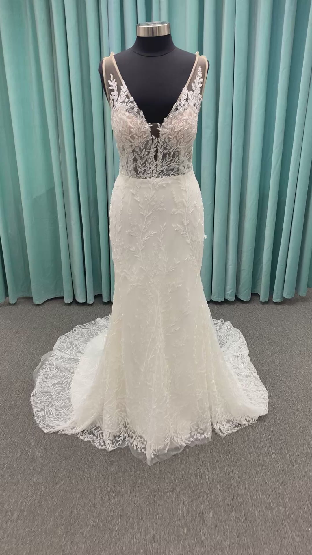 This fit-and-flare wedding dress features vintage-style beaded lace, combining classic elegance with a touch of nostalgic charm. The intricate beading enhances the lace detailing, creating a timeless and romantic bridal look.